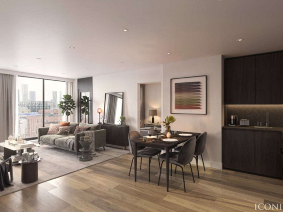 Apartments feature sleek modern interiors with timber flooring, fitted wardrobes, integrated appliances, and elegant bathrooms. Panoramic 180-degree views capture London’s skyline, from sunrise to sunset.